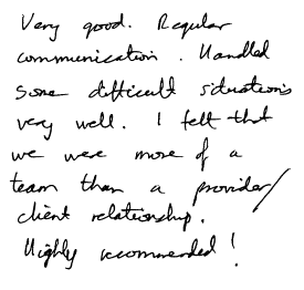 | In Referenceline's view, this track record is more important than the ratings. Don't be impressed by a few old reviews which may not be representative. Look for firms with a commitment to asking for feedback - good or bad - from their customers. We recommend that you look for a track record of ratings and reviews in at least 9 of the last 12 months and that you should not be too concerned about an isolated negative review. Ask the firm for their side of the story. | ||