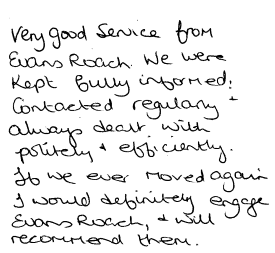 "Very good service from Evans Roach. We were kept fully informed, contacted regularly & always dealt with politely & efficiently. If we ever moved again I would definitely engage Evans Roach, & will recommend them."