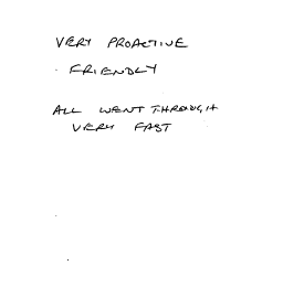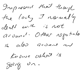 "Impressed that though the I normally dealt with is not around. Other negotiator is also aware and knows what is going on."