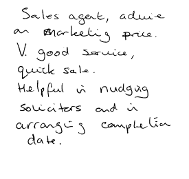 "Sales agent, advice on marketing price. Very good service, quick sale. Helpful in nudging solicitors and in arranging completion date."