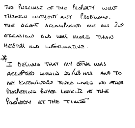 "The purchase of the property went through without any problems. The agent accompanied me on 2 occasions and was more than helpful and informative. I believe that my offer was accepted within 24/48 hrs and to my knowledge there were no other prospective buyer looking at the property at the time."