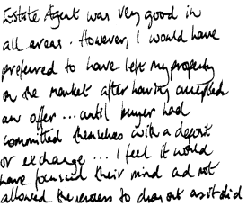 "Estate agent was very good in all areas. However, I would have preferred to have left my property on the market after having accepted an offer until buyer had committed themselves with a deposit or exchange. I feel it would have focused their mind and not allowed the useless to drag out as it did."