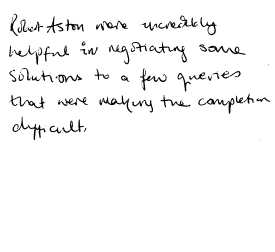 "Robert Aston were incredibly helpful in negotiating some solutions to a few queries that were making the completion difficult."