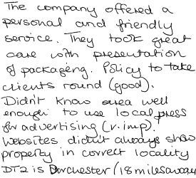 "The company offered a personal and friendly service. They took great care with presentation of packaging. Policy to take clients round good. Didn't know the area well enough to use local press advertising. Websites didn't always show property in correct locality."
