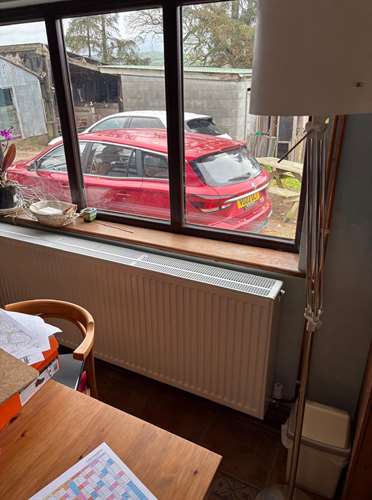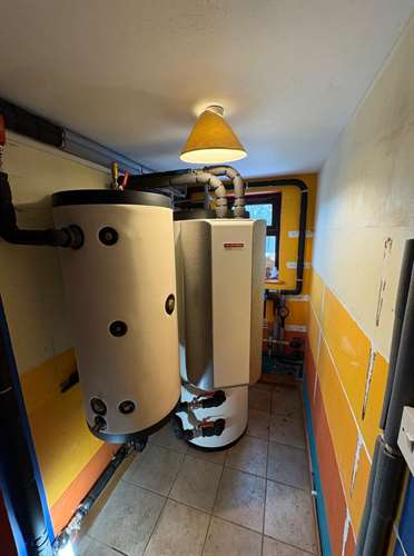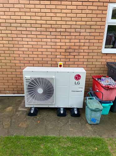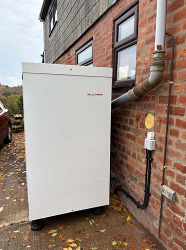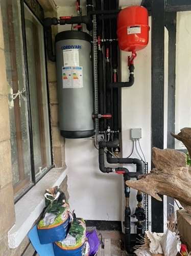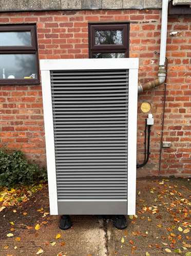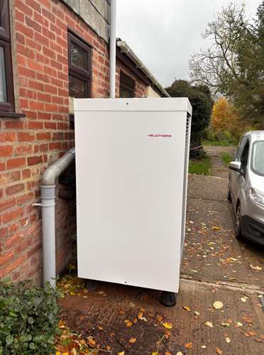 Installation of Heliotherm Air Source Heat Pump, installation of central heating system comprising twenty-three radiators and a hot water tank.