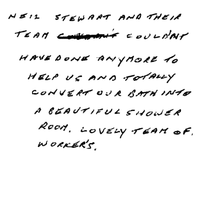 "Neil Stewart and their team couldn't have done any more to help and totally converted our bath into a beautiful shower room. Lovely team of workers."