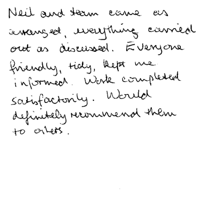 "Neil and team came as arranged, everything carried out as discussed. Everyone friendly, tidy kept me informed. Work completed satisfactorily. Would definitely recommend them to others."
