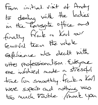 "Andrews removal team – pleasant, kind and helpful. Nothing was too much trouble, very pleased with the experience."