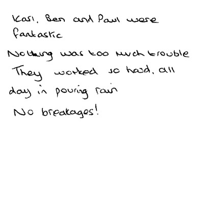 "Karl Ben and Paul were fantastic. Nothing was too much trouble. They worked so hard all day in pouring rain. No breakages!"