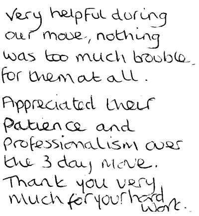 "Very helpful during our move, nothing was too much trouble for them at all. Appreciated their patience and professionalism over the three day move. Thank you very much for your hard work"